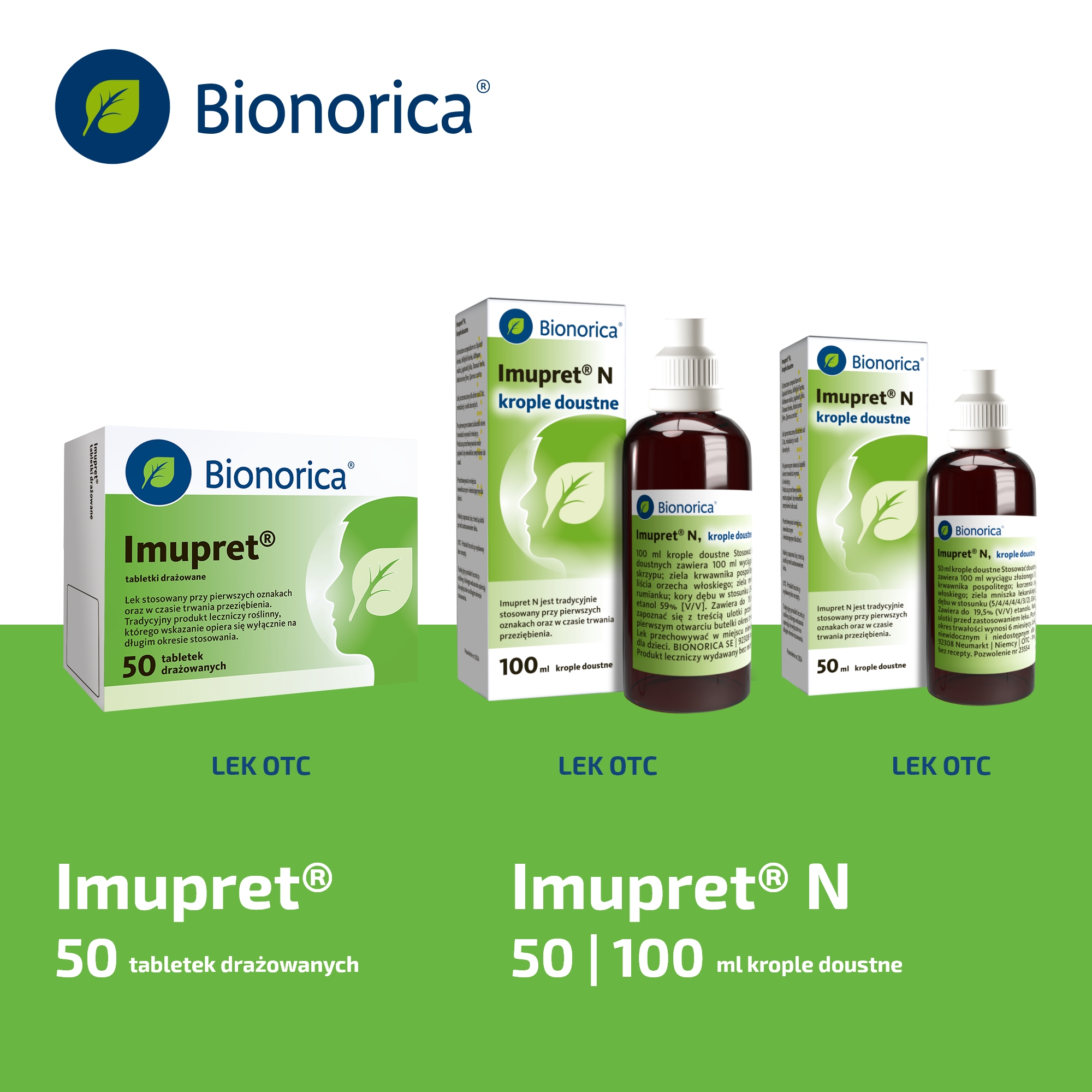 Nazwa produktu leczniczego: Imupret N, krople doustne; Imupret, tabletki drażowane. Produkt złożony. Krople doustne zawierają do 19,5% [v/v] etanolu. Postać farmaceutyczna: krople doustne; tabletki drażowane. Wskazania terapeutyczne do stosowania: Tradycyjnie stosowany przy pierwszych oznakach oraz w czasie trwania przeziębienia. Podmiot odpowiedzialny: Bionorica SE, 92308 Neumarkt, Niemcy. Informacji o leku udziela: Bionorica Polska Sp. z o.o., ul. Hrubieszowska 6b, 01-209 Warszawa.